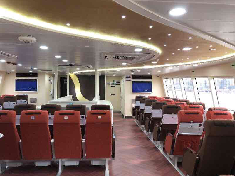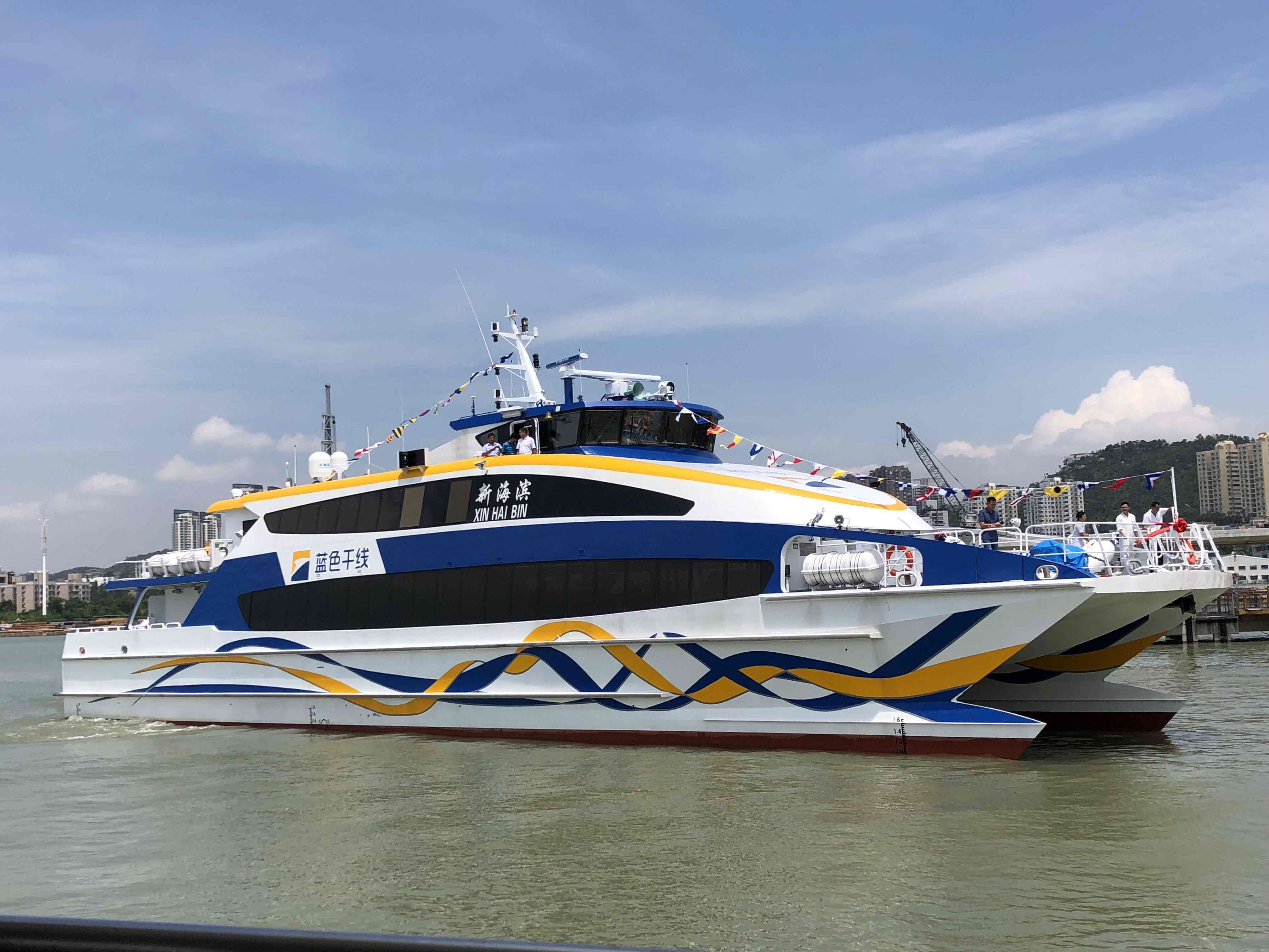 “新海滨”号是九洲控股集团为落实市政府“加密海岛航线、航班”部署,斥资2.3亿元,专门为万山海域航区“量身打造”的五艘豪华双体高速客船中的第一艘。