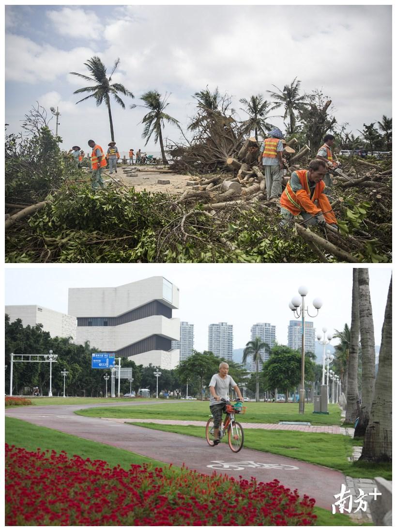 一年前,情侣路旁不少树木被吹倒,一片凌乱;