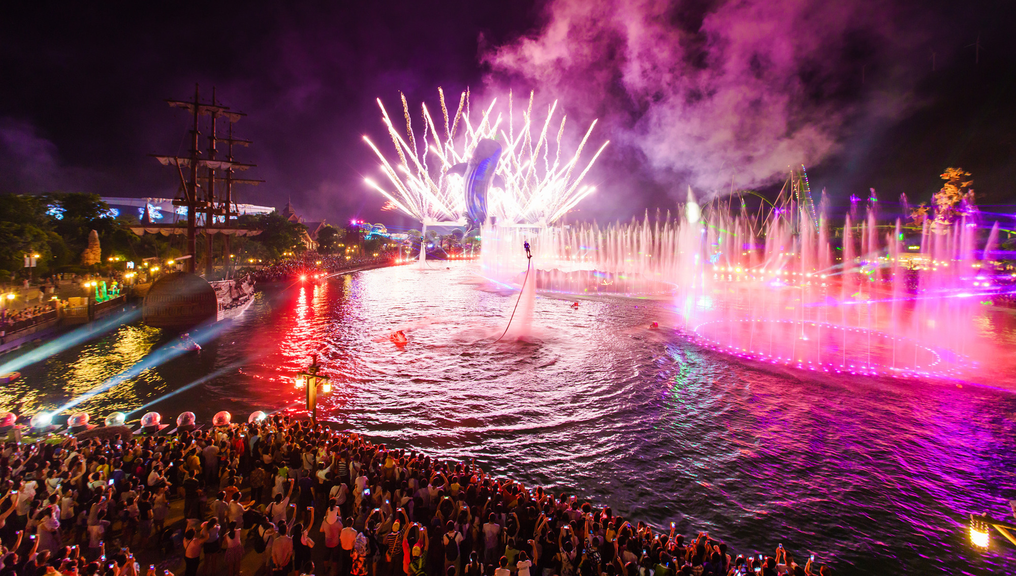 其中20:00是“国庆特别版”,将烟花和灯光喷泉完美结合,定制震撼的国庆烟花派对,与粤港澳游客欢度国庆。日常烟花汇演“海洋保卫战”将推迟到21:00上演,现场超百架无人机组成一条红色巨龙在高空飞舞,科技感十足。