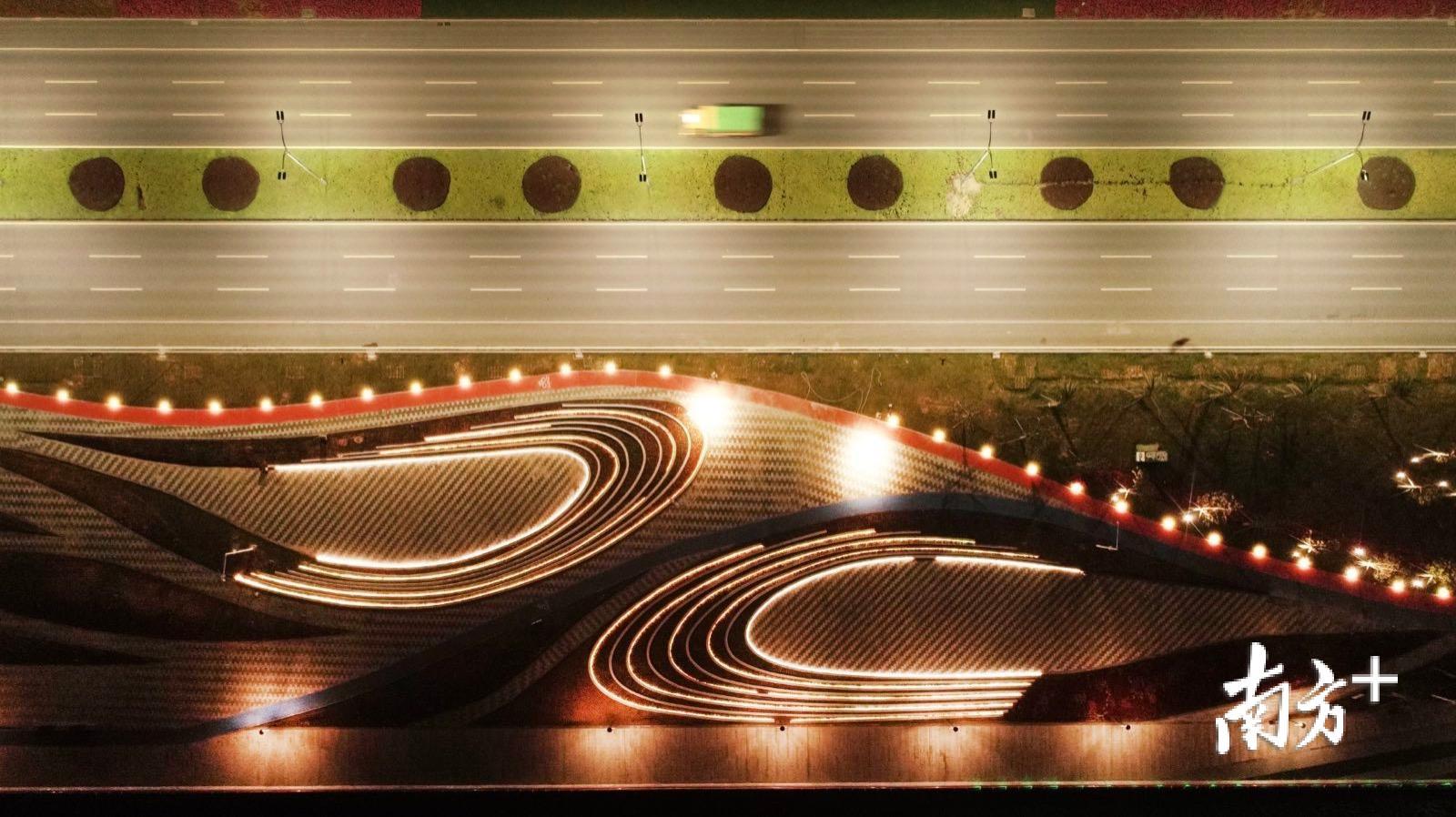 华灯初上,金湾区机场东路化身一条璀璨的光龙横卧在海岸。瑰丽的光圈沿路铺陈,绚烂的花朵在脚下旋转盛开,置身其中宛如来到童话世界。