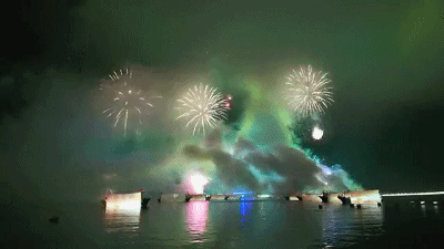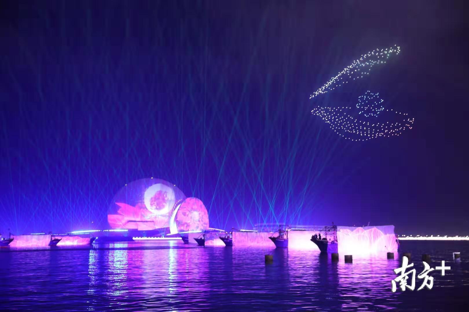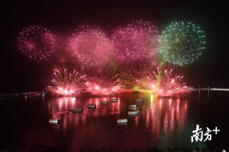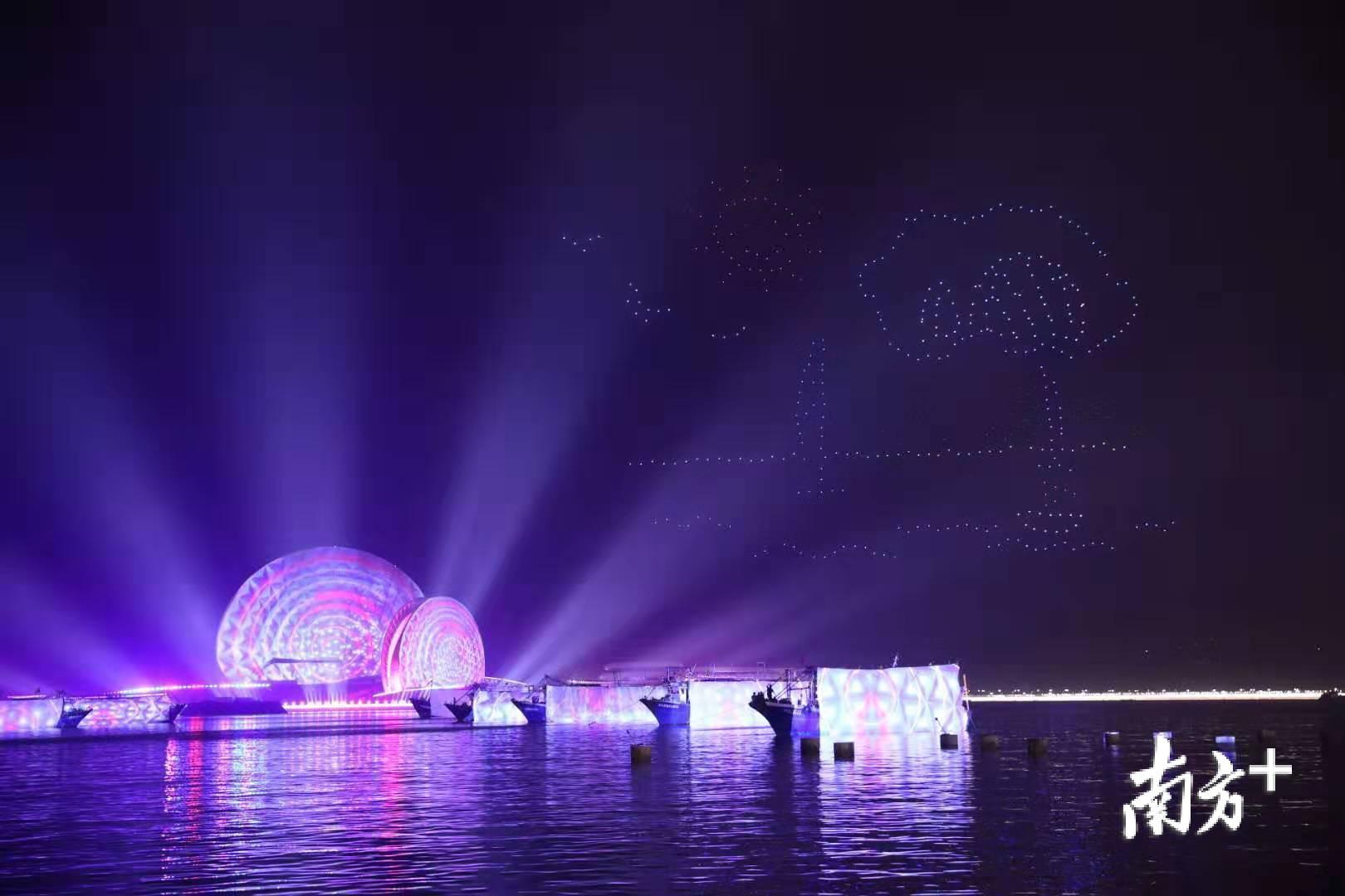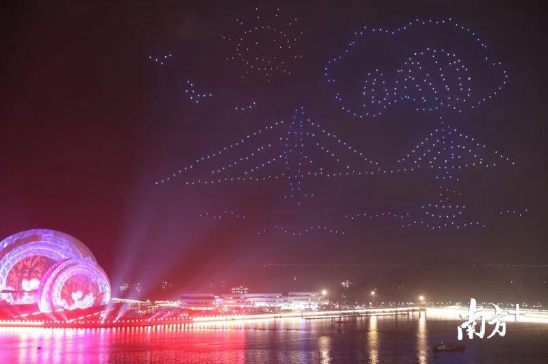 区别于其他烟花节在陆地上燃放烟花,此次光影焰火秀从香洲港附近海域内进行焰火燃放,并依远近安置船只投影灯光,使用无人机在空中组成贝壳珍珠、港珠澳大桥的形状,呈现出层次丰富的立体展演效果。