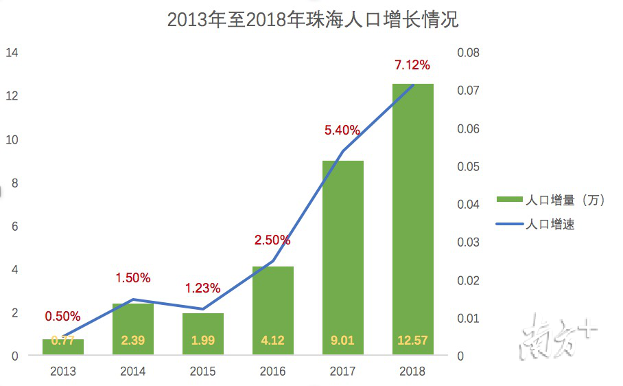12.57万的人口增量,是珠海自建市以来,常住人口年增量首次突破10万,同比增速也创近年新高,达到7.12%。