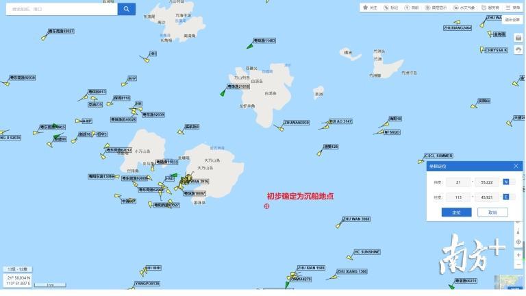 20日19时,疑似沉船位置被初步锁定,船头朝西北,船长约25m,船宽约6m,位置海底水深约26m,船体高出海底约7m,与失联渔船特征吻合。由于水下情况复杂,夜晚能见度低,难以开展水下搜寻工作,20日晚已第一时间联系南海救助局潜水员赶赴现场。