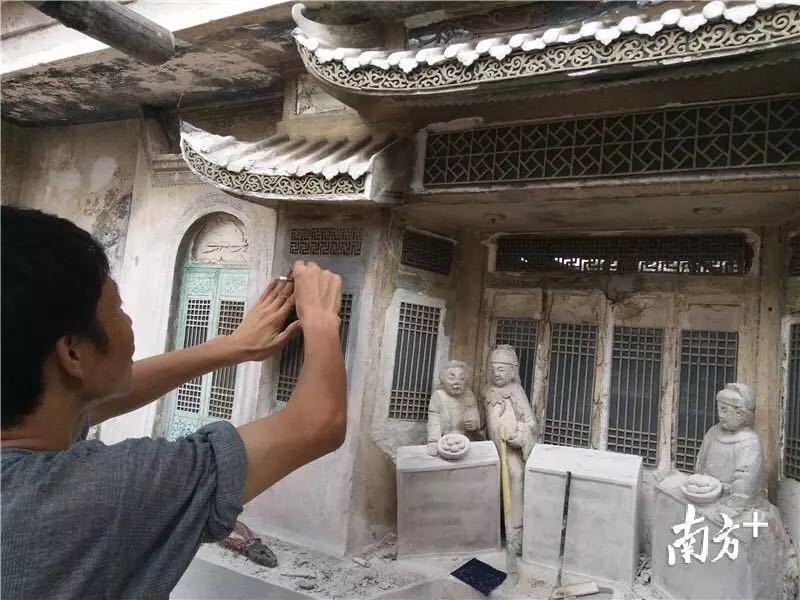 作为一名广东传统建筑名匠,他对各种建筑材料有着异于常人的熟悉和敏感。因出身潮州,他对庙宇祠堂的结构并不陌生,在广东各地修缮了不少祠堂庙宇。“传统岭南建筑涉及三雕两塑一彩,砖雕、木雕、石雕、灰塑、陶塑、彩绘,唐家三庙也是如此。”