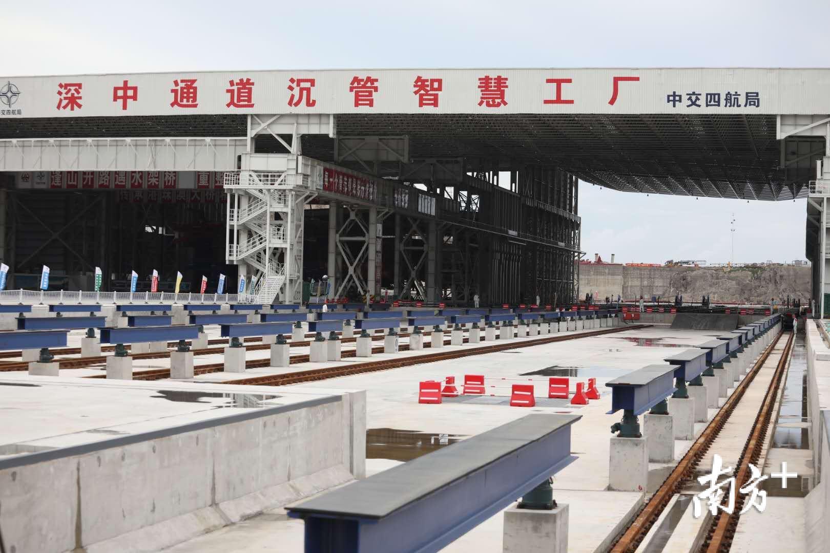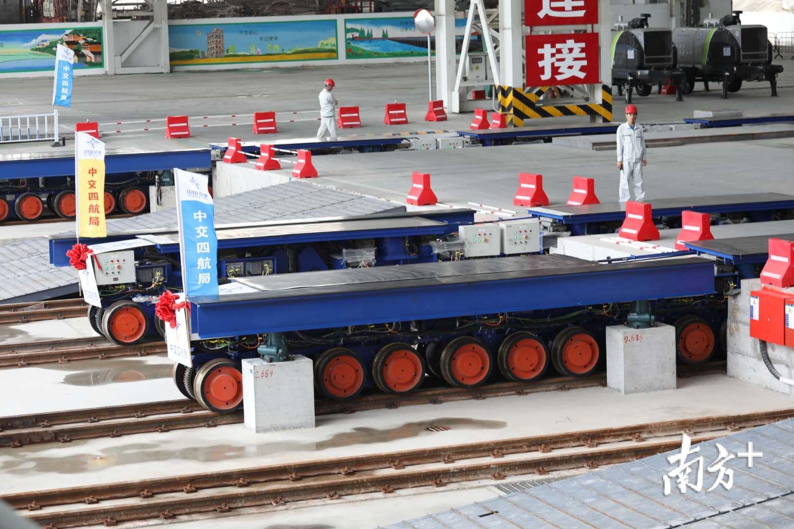 在桂山牛头岛现场,记者看到,沉管智慧工厂生产线上200辆台车蓄势待发,6台智能浇筑机整装调试,静待沉管钢壳到来。