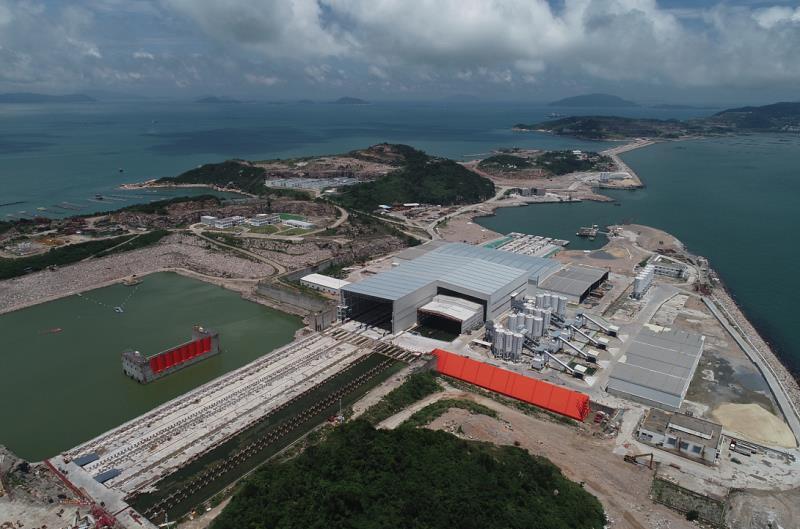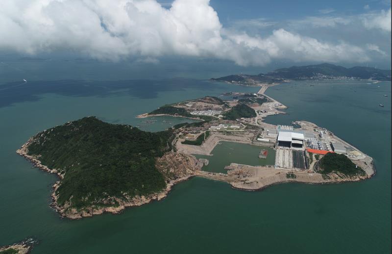 再近点。看左下角的绿色水域,它相当于一个船坞,用来放置制作好的超级沉管。
