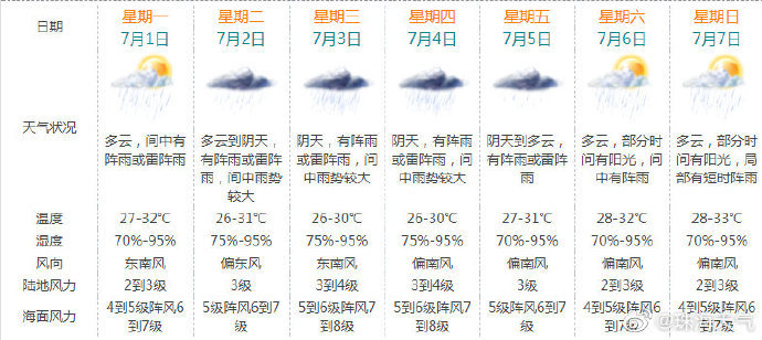 下周部分时段风雨明显,请注意海上交通和作业的各项安全;另外热带系统活跃,天气变化快,请密切留意最新预报预警信息。珠海市气象台6月30日下午发布