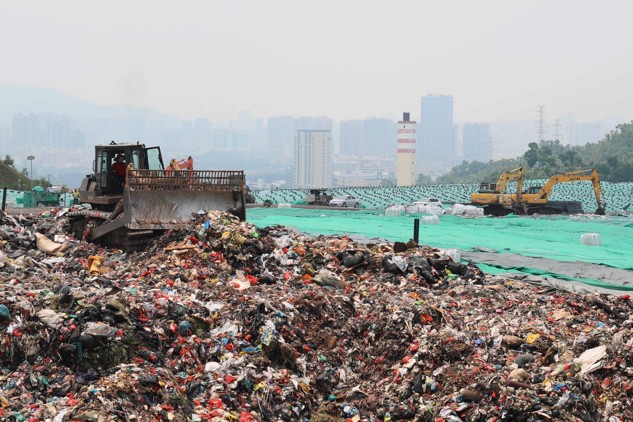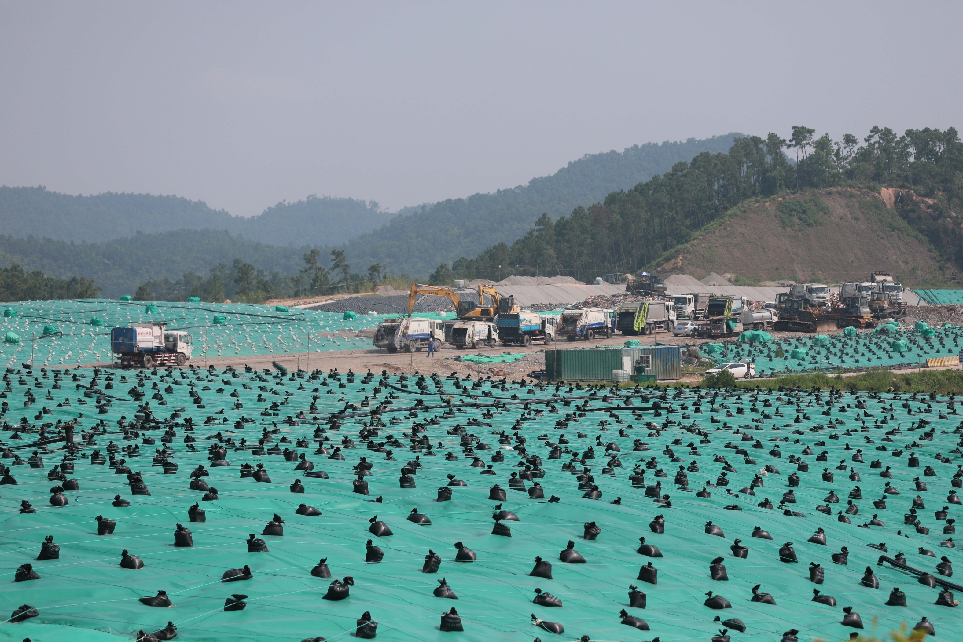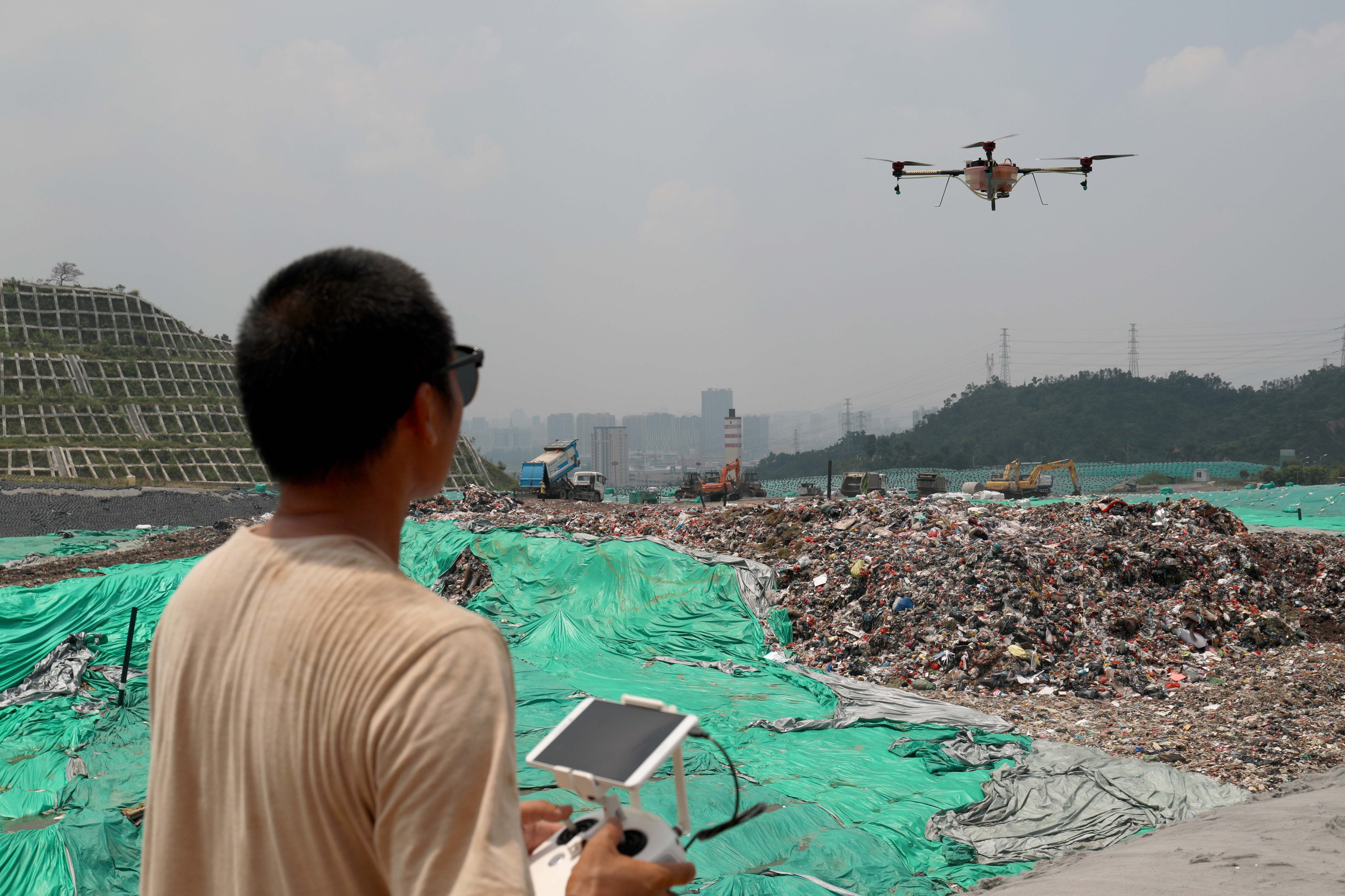 脚下是20多米高的垃圾山,目之所及的绿,不是树木葱茏,而是已被填埋、压实、覆以绿膜的垃圾,环卫车一辆接一辆开上山卸料:园林工人修剪下的树枝,人们丢弃的纯净水瓶、塑料袋、凉席……“哗”地一声卸下。位于香洲区西北部的西坑尾垃圾填埋场,无人机不时喷洒着除臭剂,但大片垃圾散发的酸腐气味依然让人掩鼻。