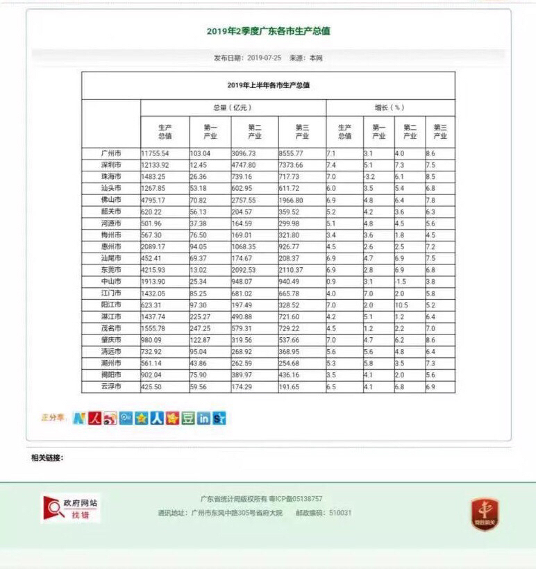 25日,省统计局官网发布2019年上半年各市生产总值。数据显示,珠海上半年地区生产总值为1483.25 亿元,增长7.0 %,高出全省0.5个百分点,与阳江、肇庆并列全省第三。
