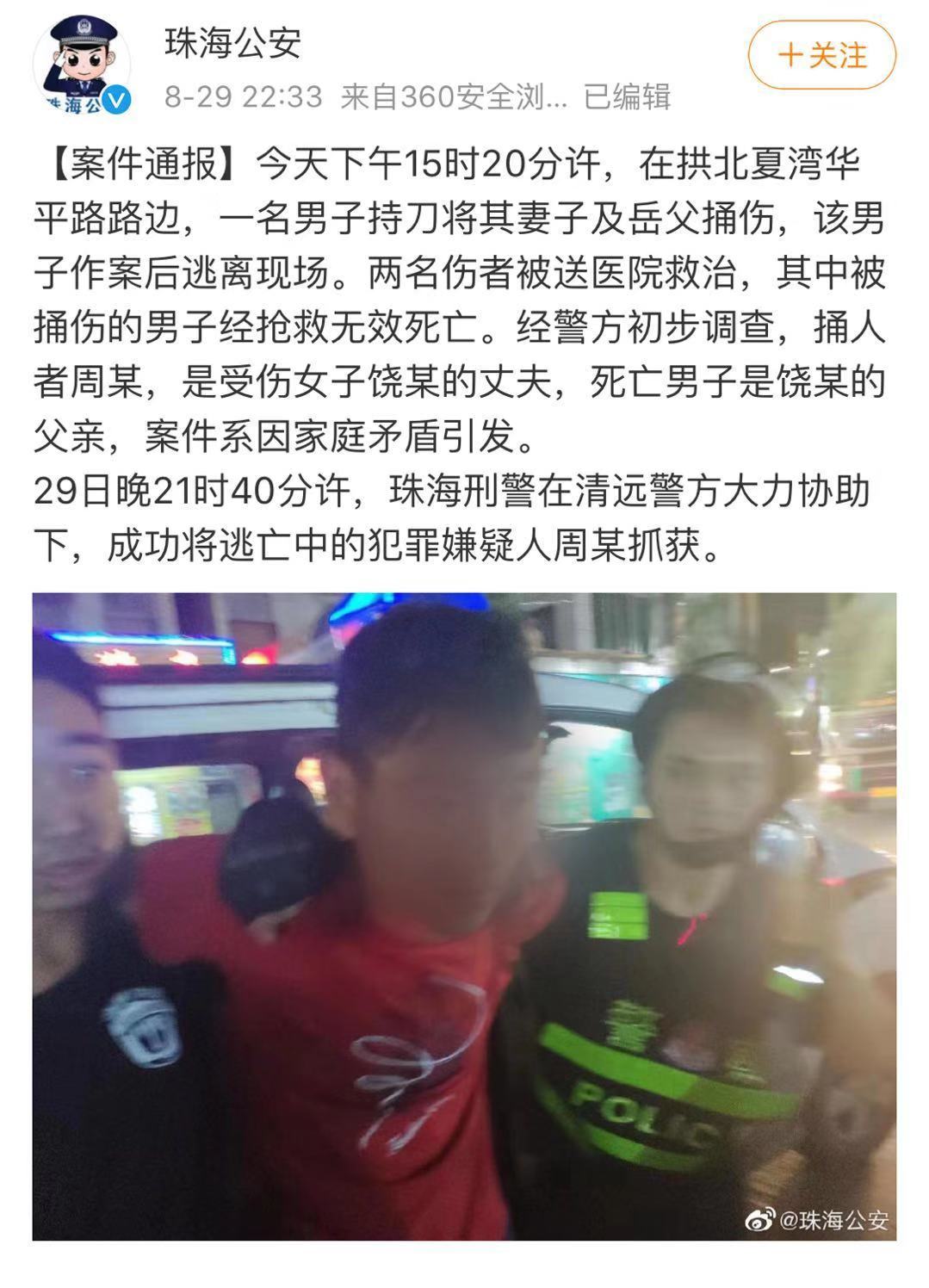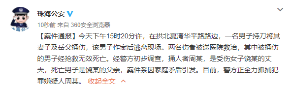 29日下午15时20分许,在拱北夏湾华平路路边,一名男子持刀将其妻子及岳父捅伤,该男子作案后逃离现场。两名伤者被送医院救治,其中被捅伤的男子经抢救无效死亡。经警方初步调查,捅人者周某,是受伤女子饶某的丈夫,死亡男子是饶某的父亲,案件系因家庭矛盾引发。目前,警方正全力抓捕犯罪嫌疑人周某。
