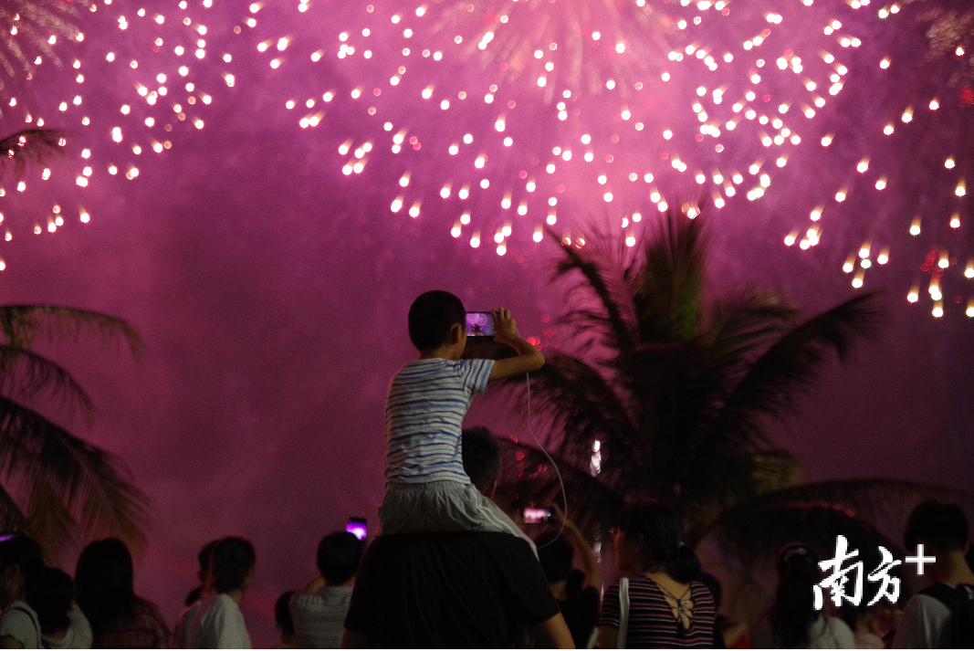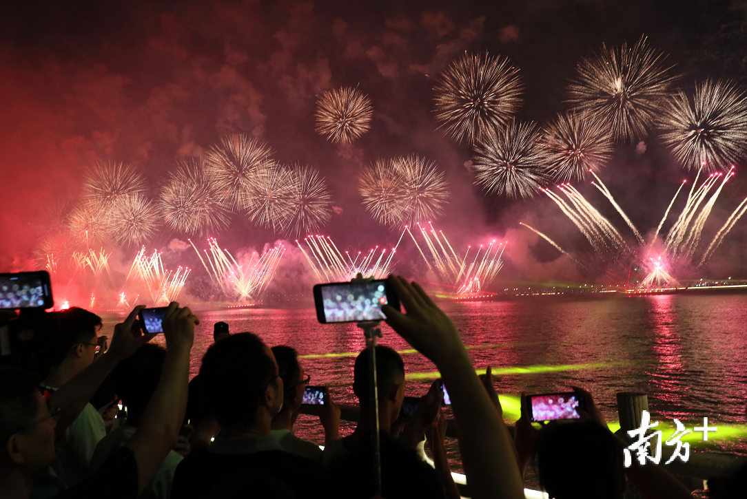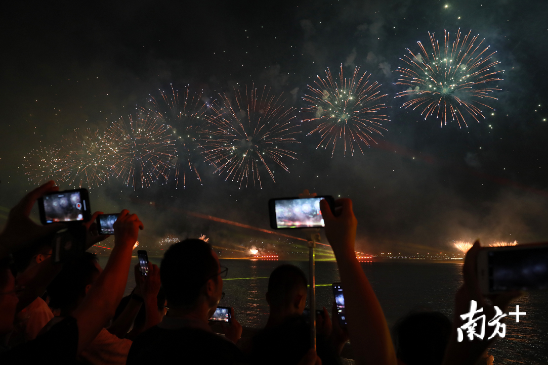 焰火晚会开始,市民纷纷举起手机,记录下绚烂一刻。