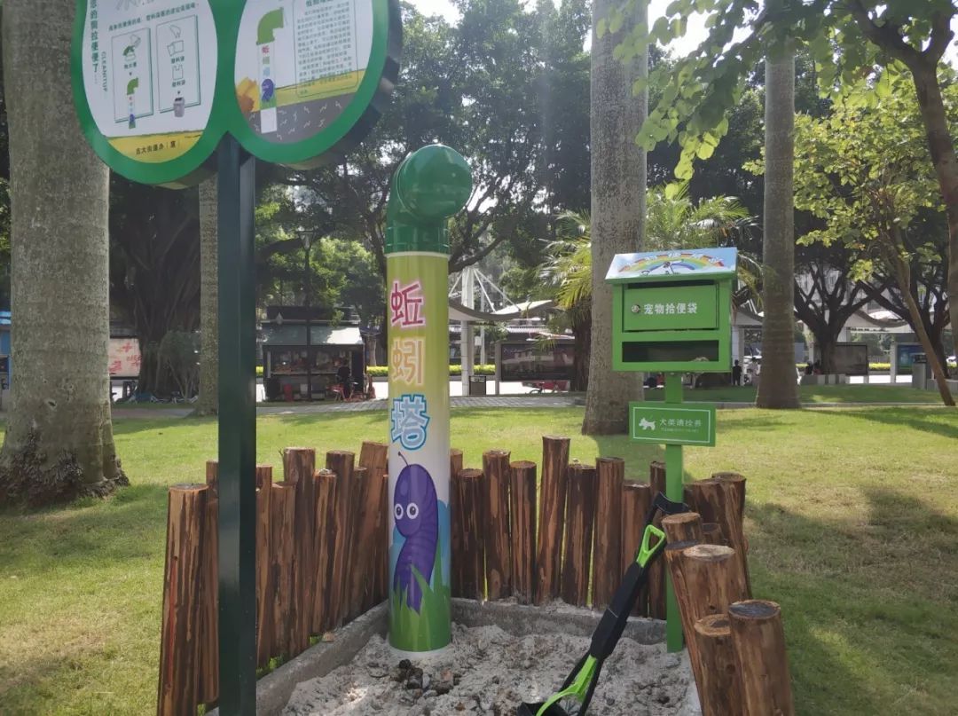 “狗狗公厕”配备了铲子、拾便袋等工具,还有一个蚯蚓塔。养犬人将犬只带到公厕沙土区排泄,然后可以用铲子丢入蚯蚓塔。蚯蚓塔应用了生物降解原理,粪便被丢进去后,蚯蚓会将粪便分解为有机肥,滋养周边草坪。