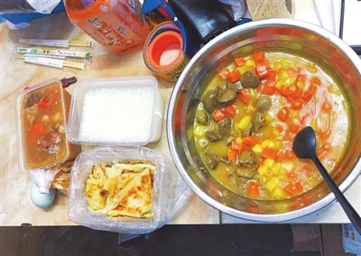 14日、15日是“双十一”快件寄递服务最忙碌的日子,港湾苑韵达快递网点(菜鸟驿站)的4名快递员忙到23时还没收工。连续两天,在社区一家地产公司上班的冯小姐都会在晚上给他们送饭,有牛肉丸胡萝卜羹、煎饼、稀饭等,如果不够吃,她还帮大家泡面。
