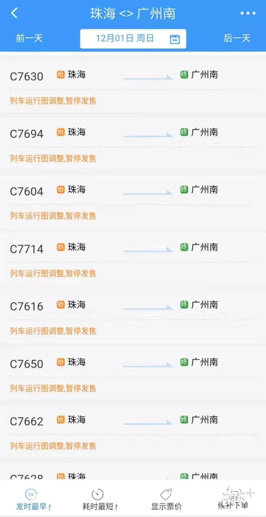 此外,中国铁路12306官网显示,自12月1日起至12月26日(火车票预售期为30天),珠海往返广州南的C字头城际列车车票已停售。有网友猜测这和已经进入通车倒计时的珠机城际一期项目有关。