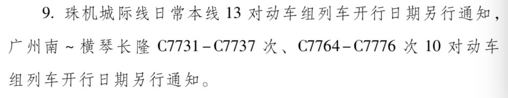 其中,广州南到横琴长隆车次为C7731-C7737C次,C7764-C7776次。