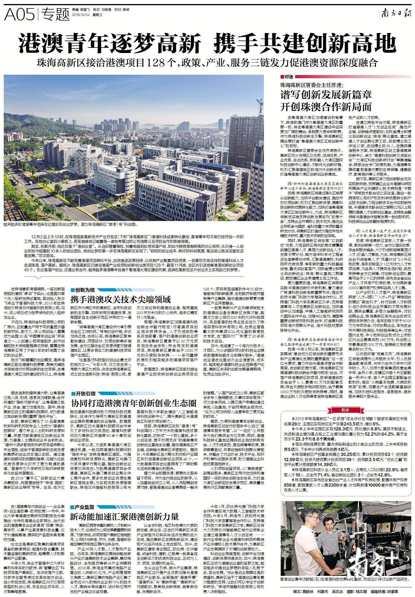 张云飞和雷震的创业蝶变,是珠海高新区联动港澳科技要素,聚焦关键技术领域进行协同创新的生动写照。在粤港澳大湾区加快建设的风口上,珠海高新区作为特区中的高新区、全市科技创新的主引擎,如何利用好港澳资源,发挥国家自主创新示范区作用成为一道新命题。