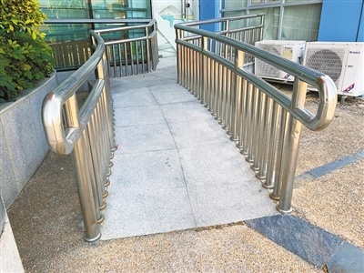 记者还发现,有些银行建设的无障碍缓坡不够规范,坡道过窄或过陡,轮椅行走不便。例如,柠溪加油站附近的某银行,给轮椅通行的无障碍通道比较窄,目测宽度不超过70厘米,轮椅上去后根本无法拐弯进入大厅;此外,吉大某银行门口的无障碍通道,贴心地设计了扶手,但由于坡度太大,一位残疾人坐着轮椅费了很大的劲也上不去,最后在旁人的帮扶下才勉强通行。相比较而言,柠溪加油站附近某银行门口的缓坡则高低适中又宽敞,轮椅上下毫不费力。