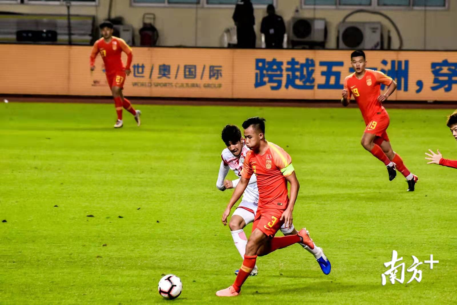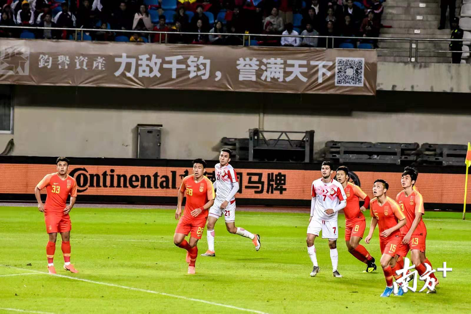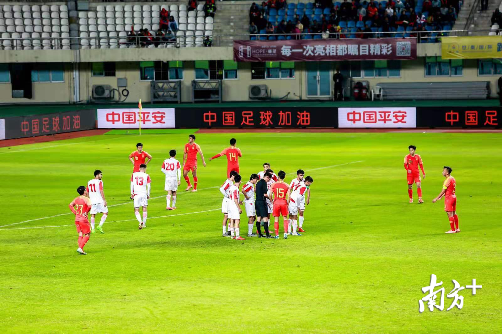 当天晚上7:35,比赛正式开始,中国队刚开场采用了频繁的长传冲吊的战术,加上积极的前场逼抢,迫使对手多次在后场传球失误,获得了多次良机,但都没能把握住,最终半场双方闷平0比0。