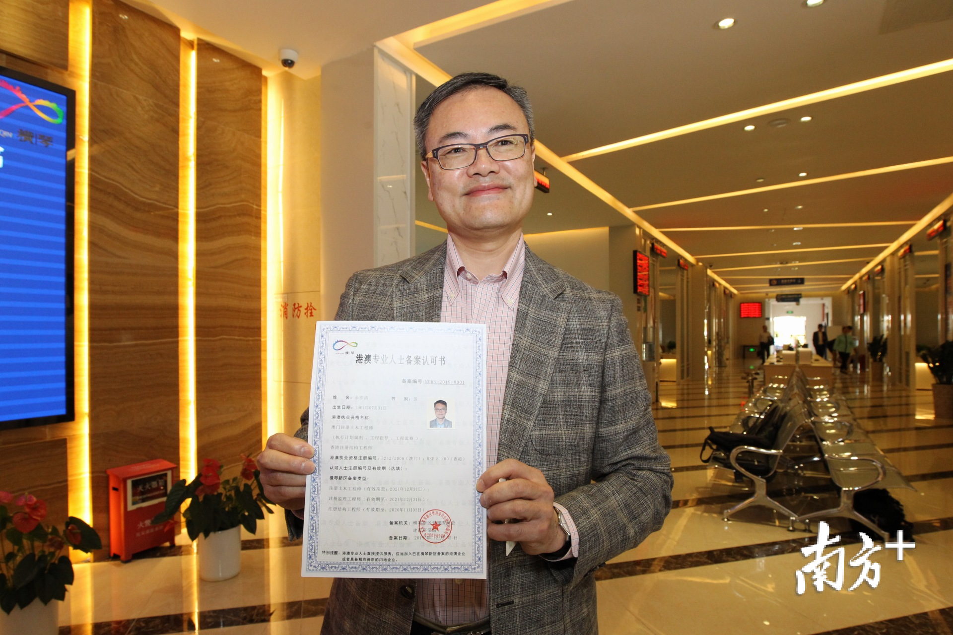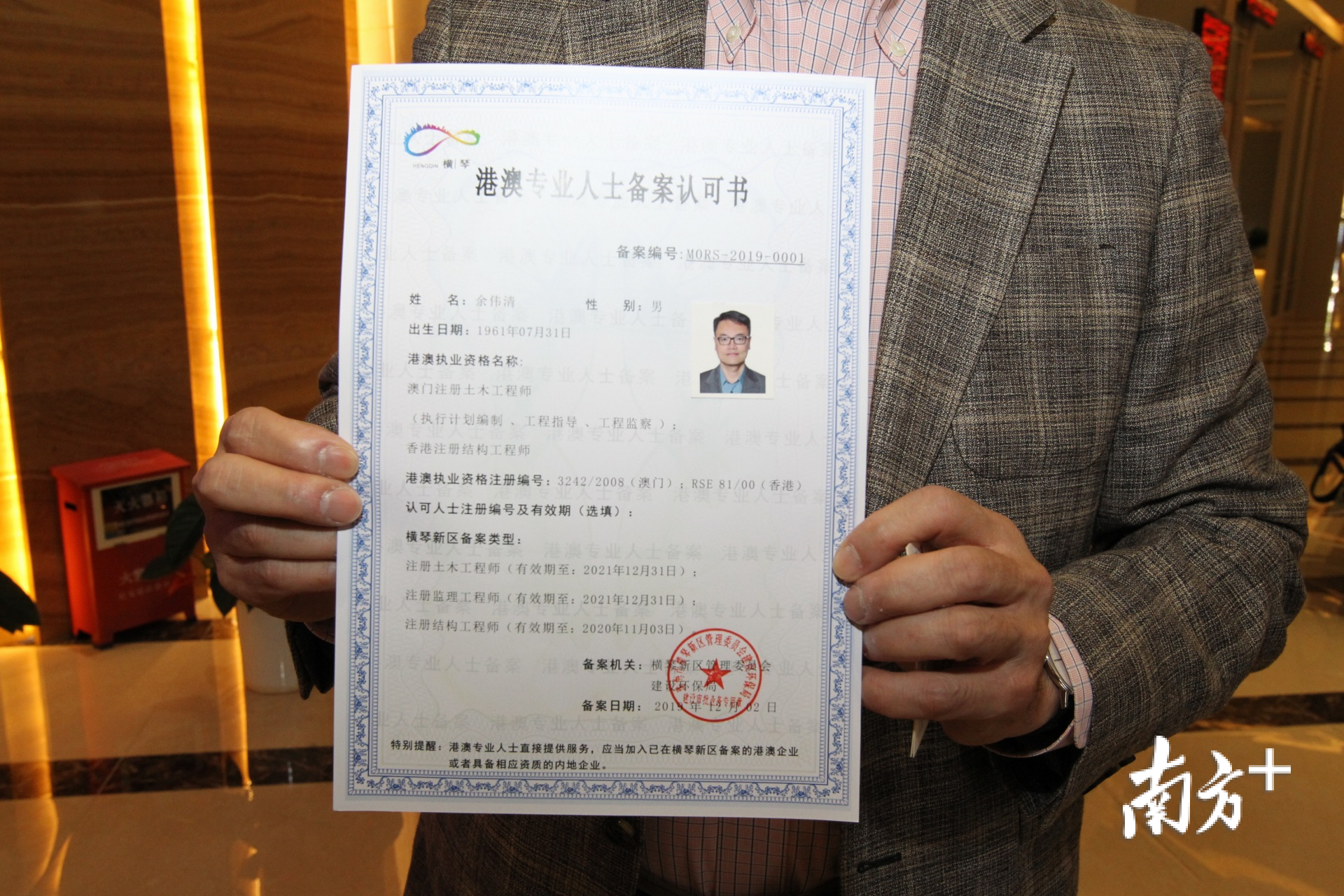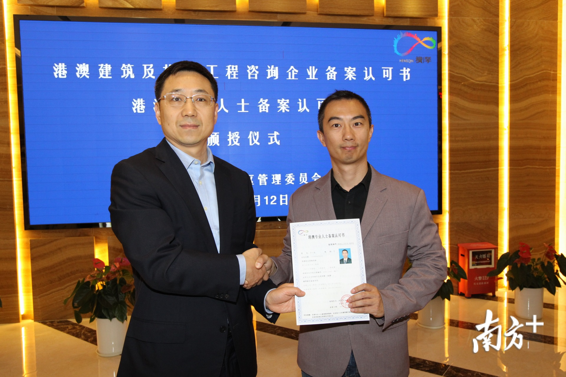 12月12日,港澳建筑及相关工程咨询企业备案许可书、港澳专业人士备案许可书的颁授仪式在珠海横琴新区综合服务中心举行。首批3位港澳建筑专业人士、2家港澳企业获颁备案许可书,今起可在横琴持证执业。