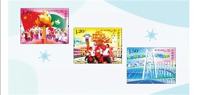 这套纪念邮票共3枚,图名、面值分别为:“爱国爱澳·薪火相传”“中西荟萃·和谐共融”2枚各1.20元、“城市建设·繁荣发展”1枚1.50元。
