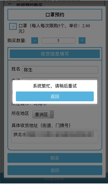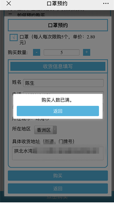 11时24分,记者成功登入信息申报页面。页面显示,口罩每人每次限购5个,单价为2.8元。记者填入姓名、手机号、 验证码、身份证号、 户籍地址、最近14天所在地和具体收货地址等信息后,页面则显示购买人数已满,预约失败。