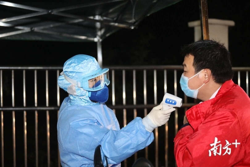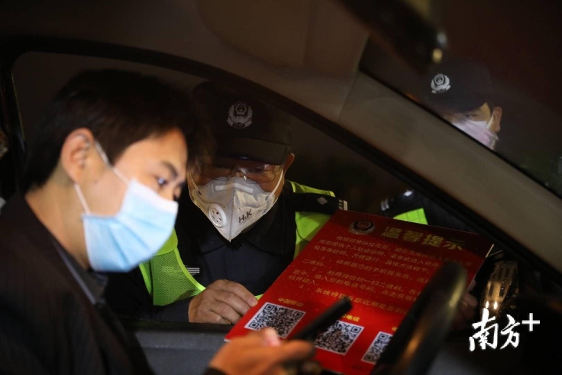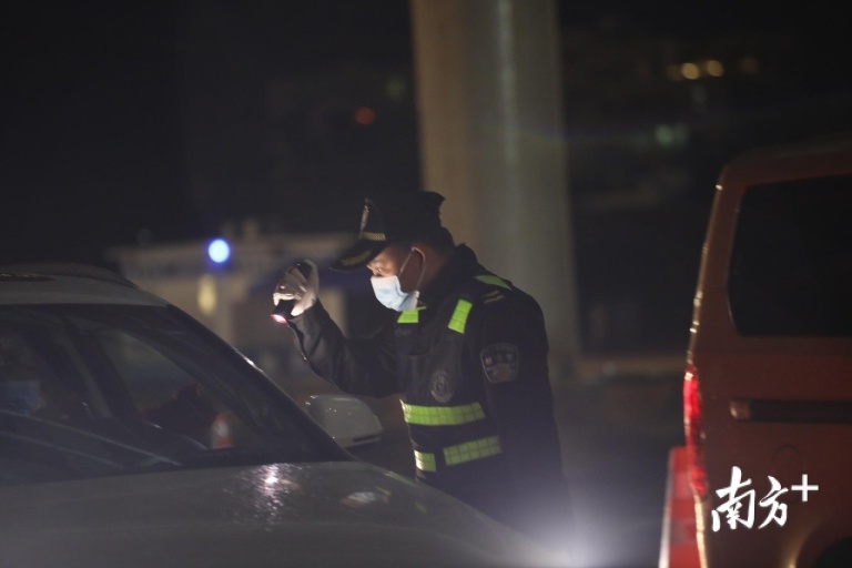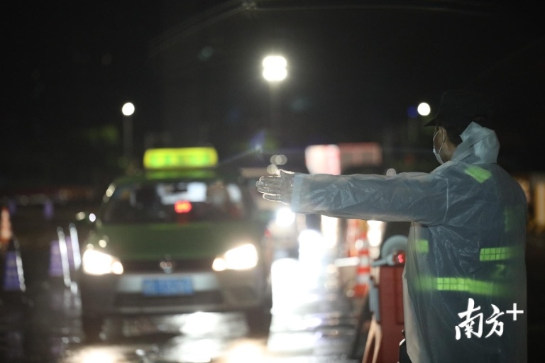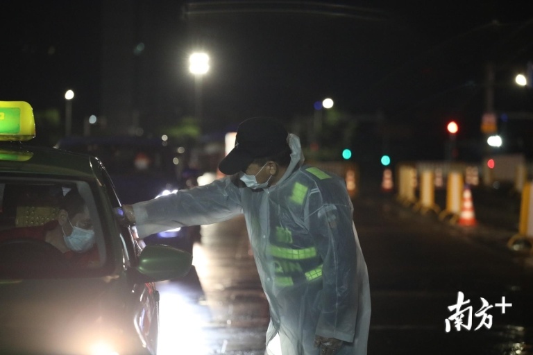 0时50分,不时仍有车辆从中山坦洲、三乡方向驶来,执勤人员一一疏导,为每一辆车上的司机、乘客测量体温。