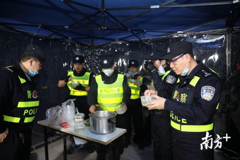 夜深了,路上车辆逐渐减少,连续工作多时的民警在简易帐篷里抽空进食补充能量。