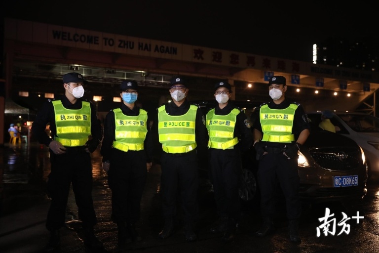 午夜12时,上冲检查站的执勤民警在冷风中对过往车辆进行检查,在进入珠海的第一道关口坚守着。