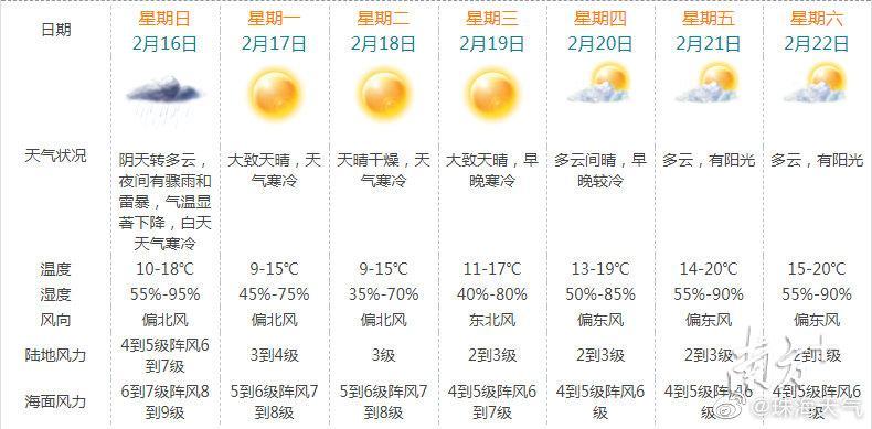 珠海市气象台于2月15日10时30分发布珠海市寒冷黄色预警信号。预计今晚受强冷空气影响,有骤雨并伴有雷暴,气温骤降;16日白天多云为主,天气寒冷;17-18日晴朗干燥,天气寒冷。