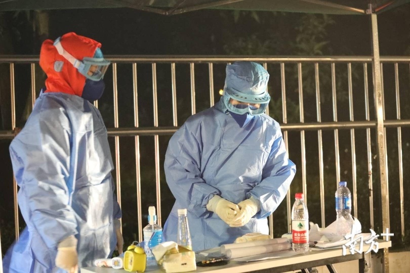 0时40分,来自香湾社区的两位女医生正在寒风中为过路人测量体温。
