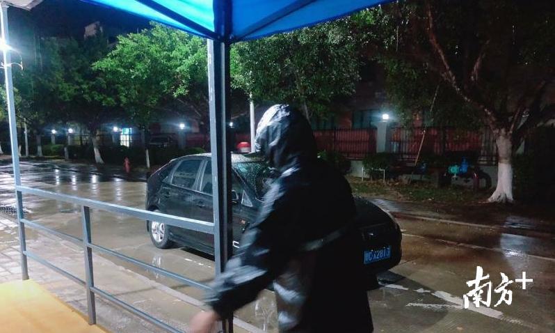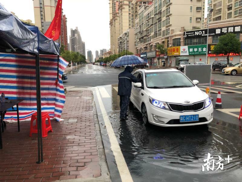 平沙镇美平社区防疫检测点的工作人员冒雨为往来人员检测体温。