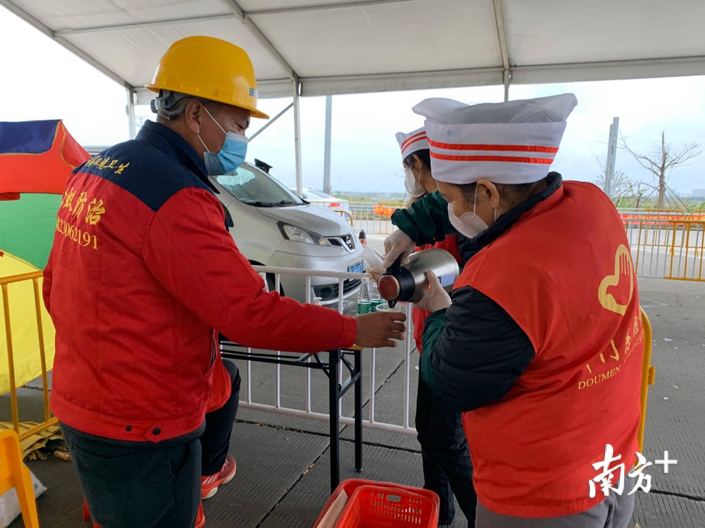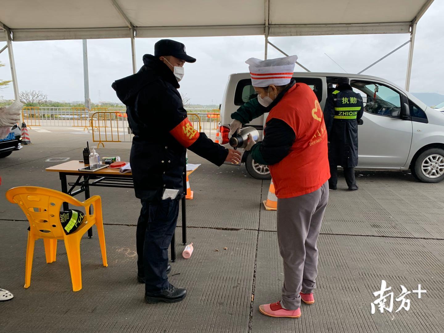 天气寒冷,但有“红马甲”的地方总能感受到温暖。这天,斗门区青年志愿者协会联合雨花斋到高速路口、社区沿途服务点开展一线防疫人员慰问暖心行动,向一线工作人员、志愿者提供爱心糖水、沙糖桔、保健茶共176份。