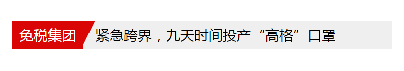 受珠海市新冠肺炎疫情防控指挥部委托,疫情期间,免税集团成员企业格力地产火速成立了高格医药公司,仅用九天时间建立起“高格”口罩生产线并投产,搭建起珠海市防疫口罩销售平台,抽调党员、干部300余人冲在防疫物资生产销售一线,面向全市企业和市民限价销售防疫口罩。