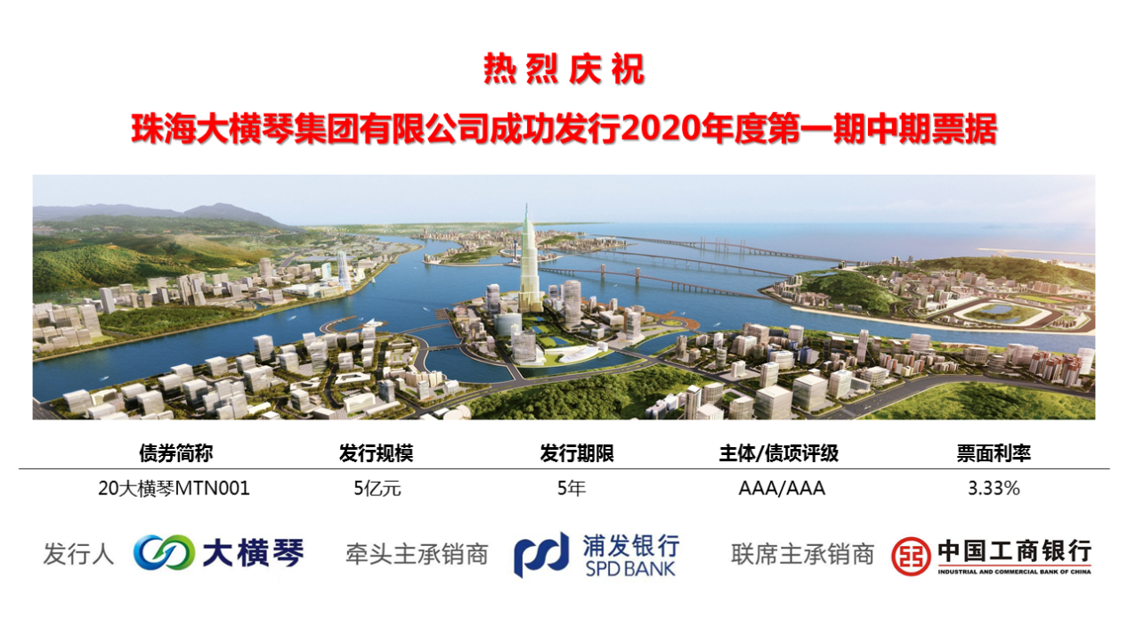 4月14日,记者从珠海大横琴集团有限公司获悉,该公司成功发行2020年第一期中期票据。据了解,本次发行金额5亿元人民币,期限为5年,主体评级及债项评级均为AAA最高信用等级,票面利率为3.33%。
