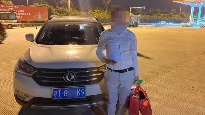4月10日晚,交警在南屏收费站开展整治行动。9点10分,一辆粤T8××K9号东风小车驶过南屏收费站,钟警官拦停车辆进行检查。▼