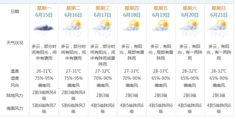 “鹦鹉”飞远,珠海又重新回归到夏日的炎热天气,周三后气温持续走高,最高温33℃。据市气象台预计,15日阴天多云,有骤雨,气温26℃-31℃;16日多云,部分时间有阳光,间中有骤雨,气温27℃-31℃;17日多云,部分时间有阳光,间中有阵雨或雷阵雨,气温27℃-32℃;18日多云,有阳光,有雷阵雨,气温27℃-33℃;19日多云,有阳光,局部有雷阵雨,气温28℃-33℃。