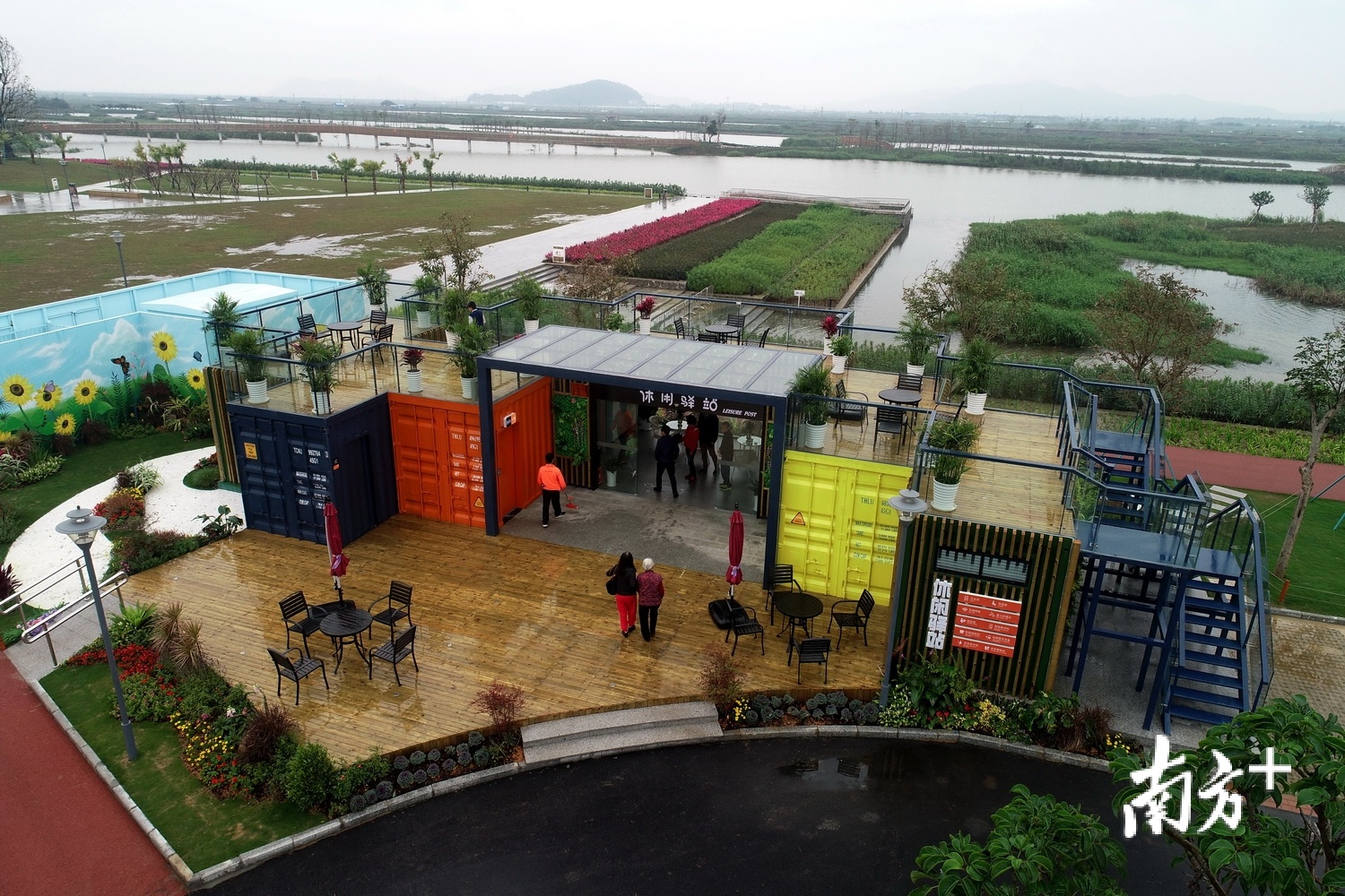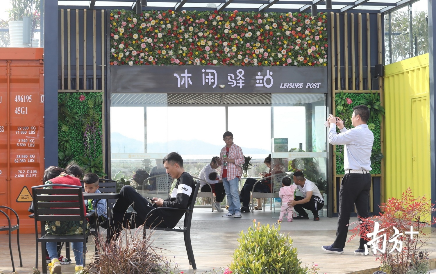金湾大门口公厕,众人在休闲区域玩乐