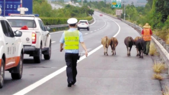 在和风山路段,往后走1公里就是服务区,可需要逆行,很危险;往前走2公里才能到珠港出口,这是将危险降到最低的方法了。李警官赶紧用警车压道,辅警、路政人员和正在附近养护的人员过来加入护送行列,把五头牛往珠港出口赶去。