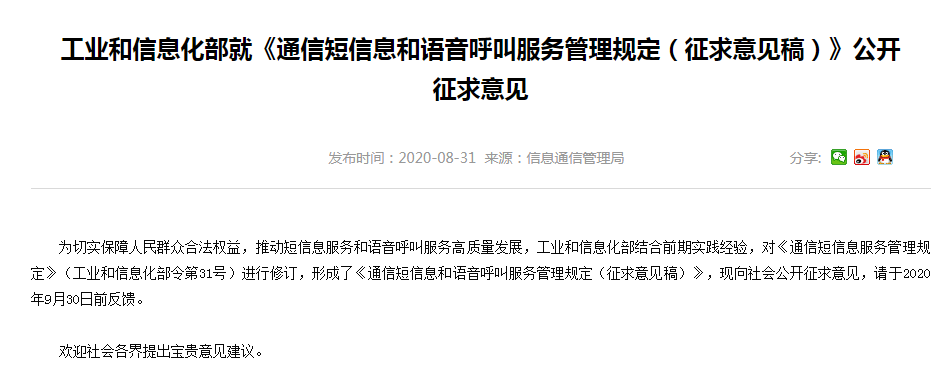 针对垃圾短信、骚扰电话有关部门又出手了!8月31日,工信部发布《通信短信息和语音呼叫服务管理规定(征求意见稿)》(下简称《意见稿》),向社会公开征求意见。