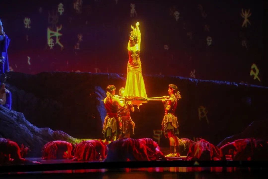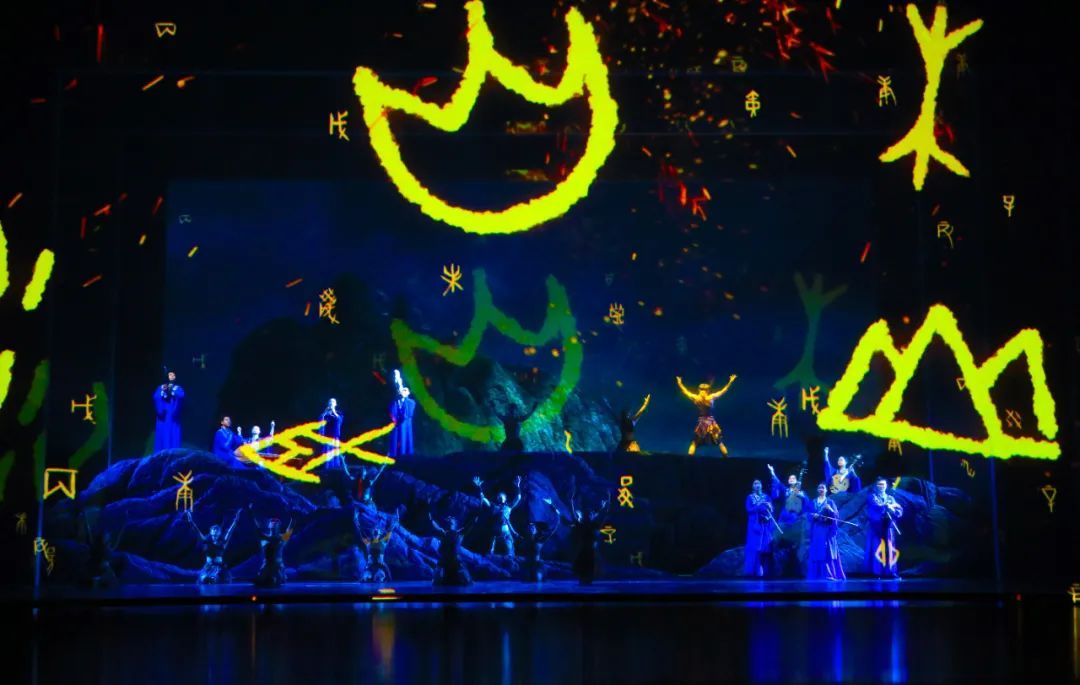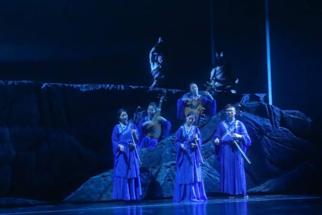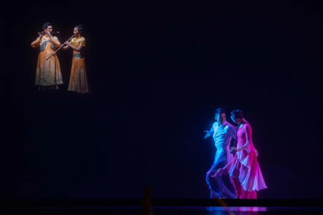 除了音乐,情景表演也被融入到了演奏中。现场将多媒体及舞美装置进行多维空间布局,虚实结合。演员们在悠扬的音乐伴奏下翩翩起舞,演绎出湾区先民们劳作生活、生生不息的场景。