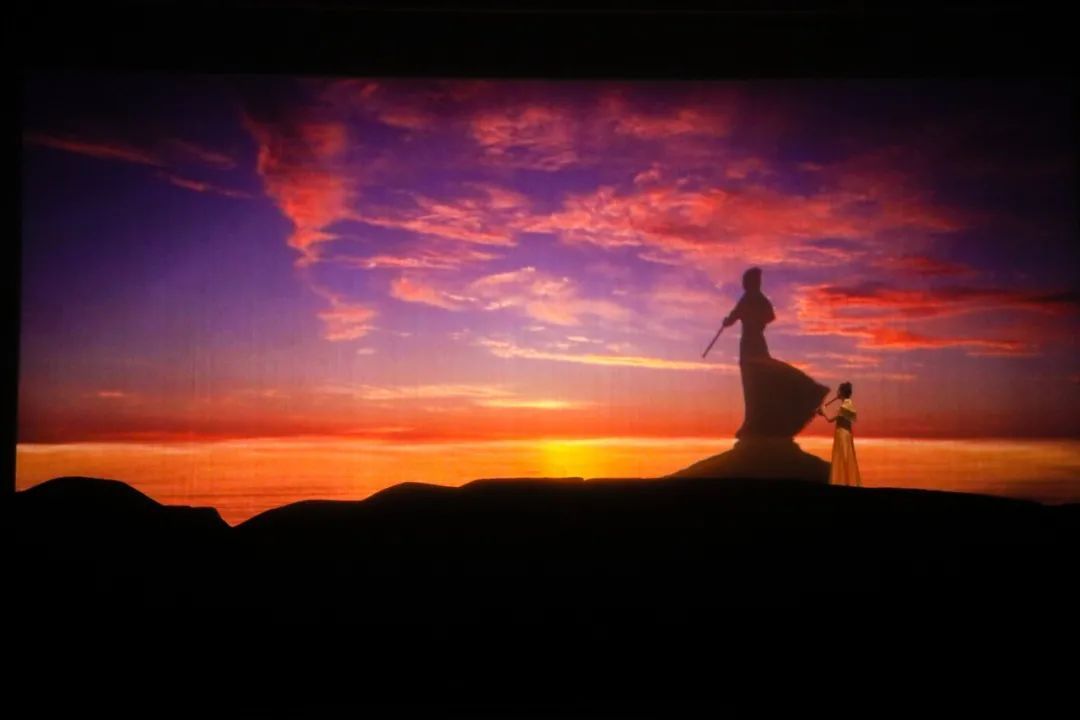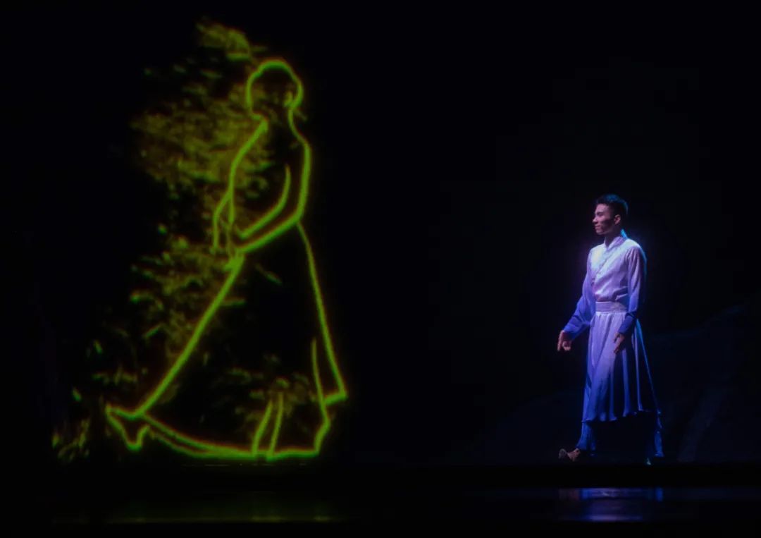 通过创意“线阵”,营造全息空灵舞台。将光影、抠像、无缝沙幕、二维动漫、正反面双投影和舞台实体造景相融合,视听共融、观演互动。中国写意山水画虚实结合的多媒体设计,营造出视听一体的沉浸式观演氛围。