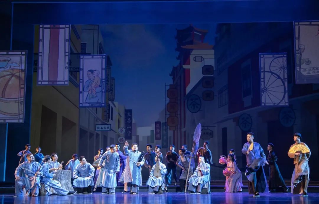 篇章中民俗乐曲活泼、俏皮,演员唱词诙谐、幽默,将广东地区人们的日常生活浓缩在了这方舞台。众友相聚,饮得一壶茶、齐奏一曲乐,谈古论今。