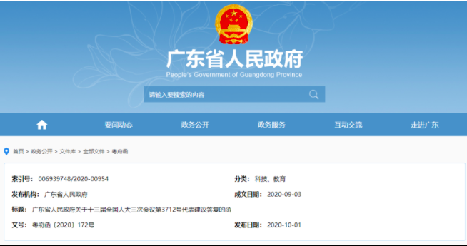10月1日,《广东省人民政府关于十三届全国人大三次会议第3712号代表建议答复的函》(以下简称《答复函》)在广东省人民政府网站发布。