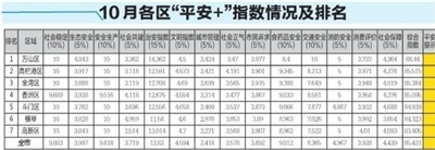 与9月对比,10月全市有四项指标得分略微上升,社会共建3.719分、市民诉求3.892分、消防安全4.967分、消费评价3.928分。五项指标得分略微下降,社会稳定9.883分、文明指数4.594分、社会正气3.578分、食药品安全9.012分、社会保障4.439分。
