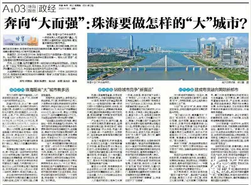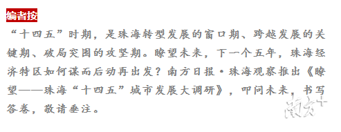 然而,人口总量、经济总量在未来一段时间内仍将是珠海的短板。迎难而上,在“十四五”即将开局之际,珠海提出,到2035年常住人口超过500万,经济体量超过2万亿元,为全国全省发展大局作出更大贡献。