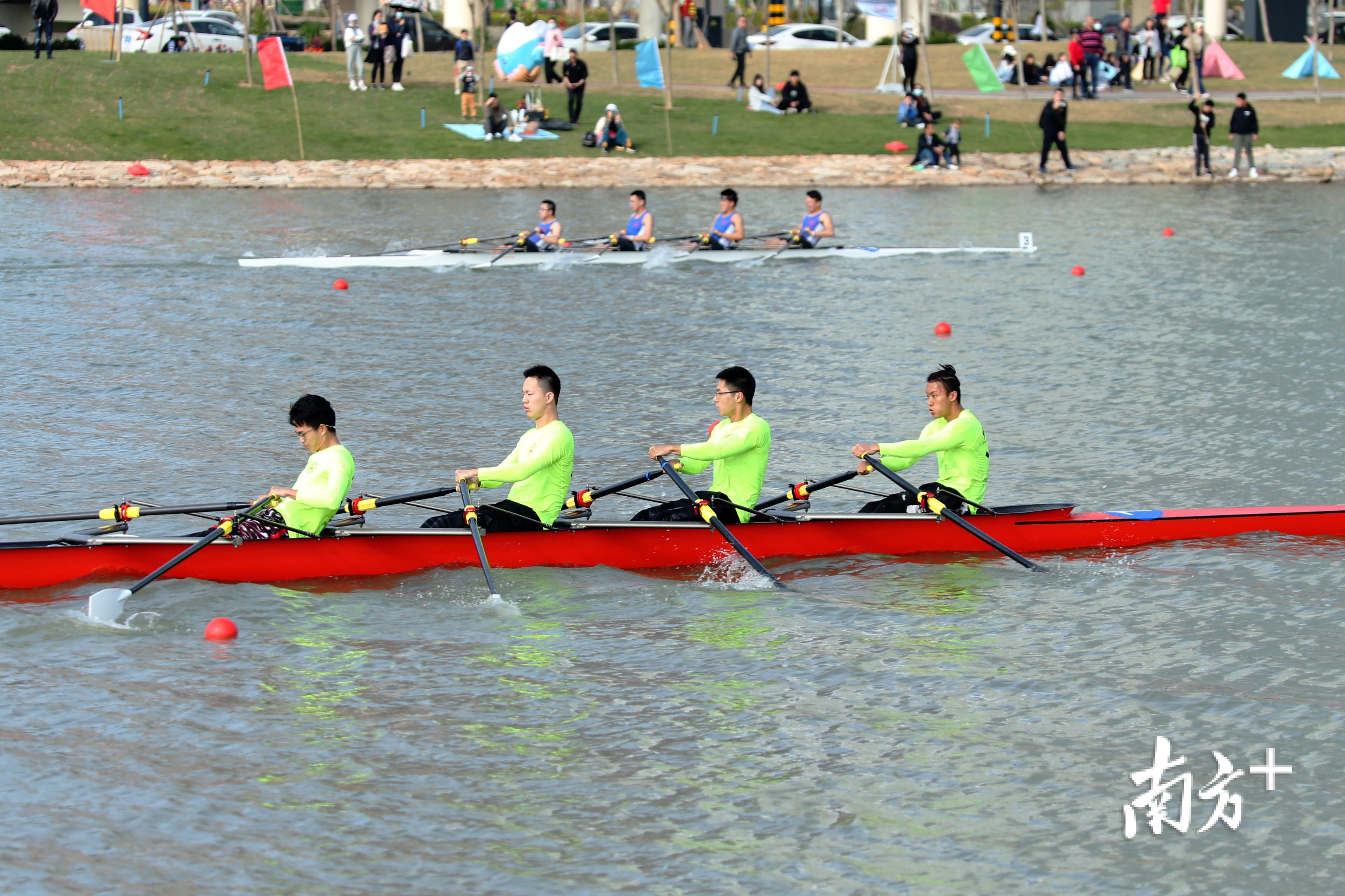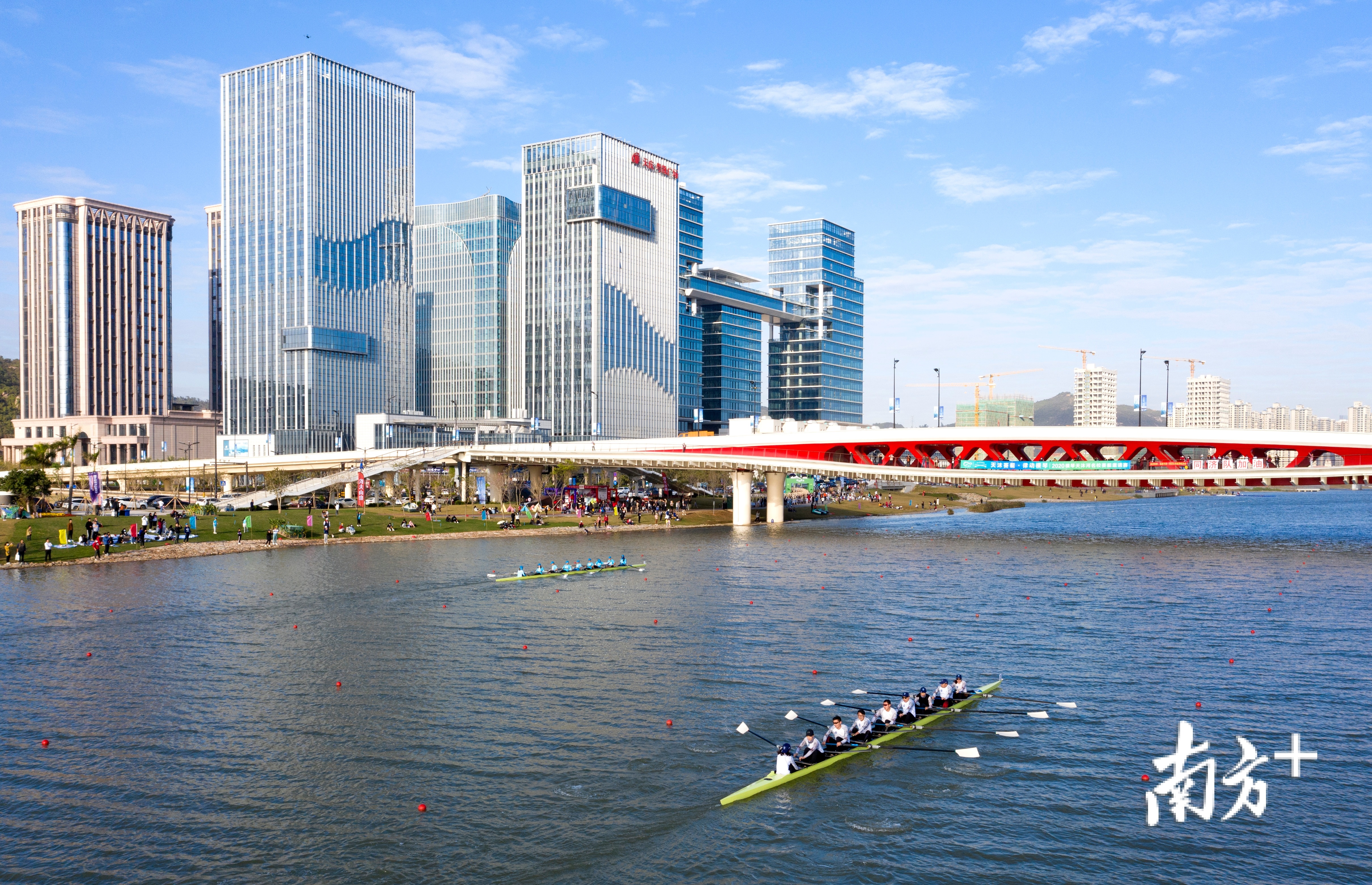 比赛在横琴天沐河留留桥与福福桥之间展开角逐,两岸观众齐声欢呼下,运动员们放舟河面、挥桨如飞、奋勇争先,在碧水间划出一条条飞快的弧线。