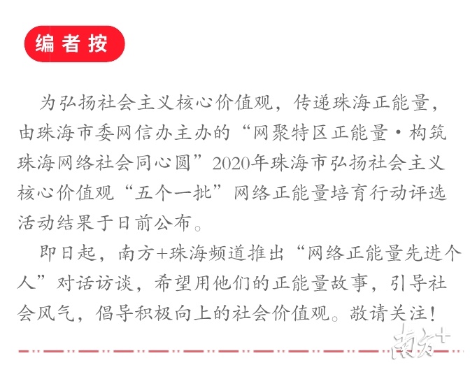 陈伟光:在珠海建市40周年之际,我带领珠海和怒江500名青年在珠海地标日月贝用一场快闪为珠海“庆生”;在澳门回归20周年之际,我作为导演与央视联合举办“一路欢歌 扬帆起航”大型融媒体直播活动。这些活动,通过中央广播电视总台、广东台、南方日报等媒体的报道,在全国范围内产生了强烈反响,将公益活动的影响力、将珠海的好声音,传播得更高更远,我觉得能对网民起到一定的带动作用,现在越来越多的珠海人加入了这个行列。