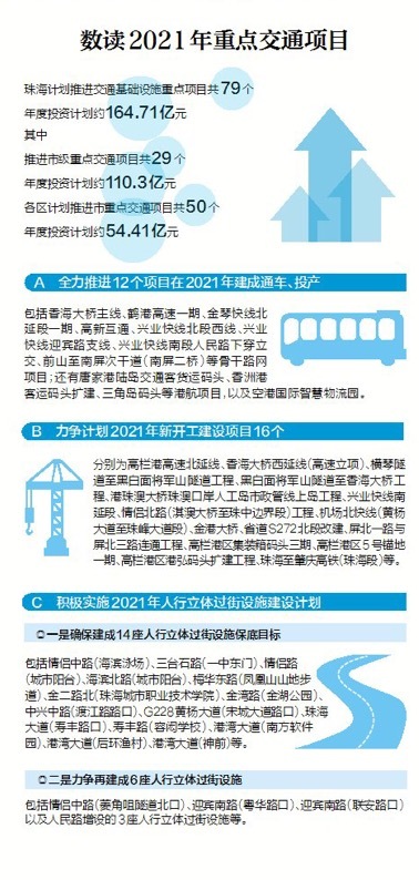 据张宜生介绍,珠海年内计划建成14座人行立体过街设施,在此保守目标基础上,力争再建成6座,明年再谋划设计建设35座;同时,还将继续推进陆岛交通公交化工作,继续实施惠民购票政策;稳步推进香洲港客运码头(改扩建)建设,建成唐家港陆岛交通客货运码头,继续开辟珠海直通深圳“水上巴士”航线;研究出台洪鹤大桥2021年免费通行的惠民政策;深化交通与旅游融合发展,加快建设省滨海旅游公路珠海段。