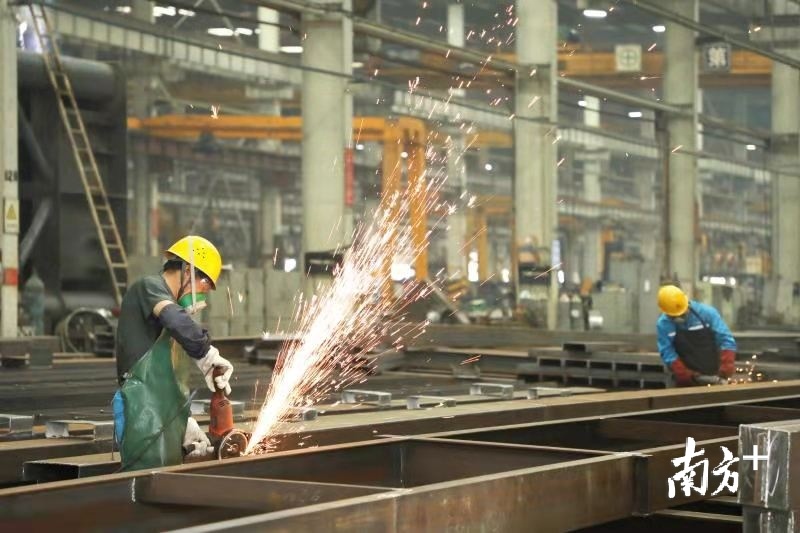 在杭萧钢构(广东)有限公司(下称“杭萧钢构”)的生产车间里,一块块厚重的巨大钢板在切割机下火花四溅,溅起的焊花抛出一道道弧线,重达数十吨乃至上百吨的巨型钢构件正在成型。