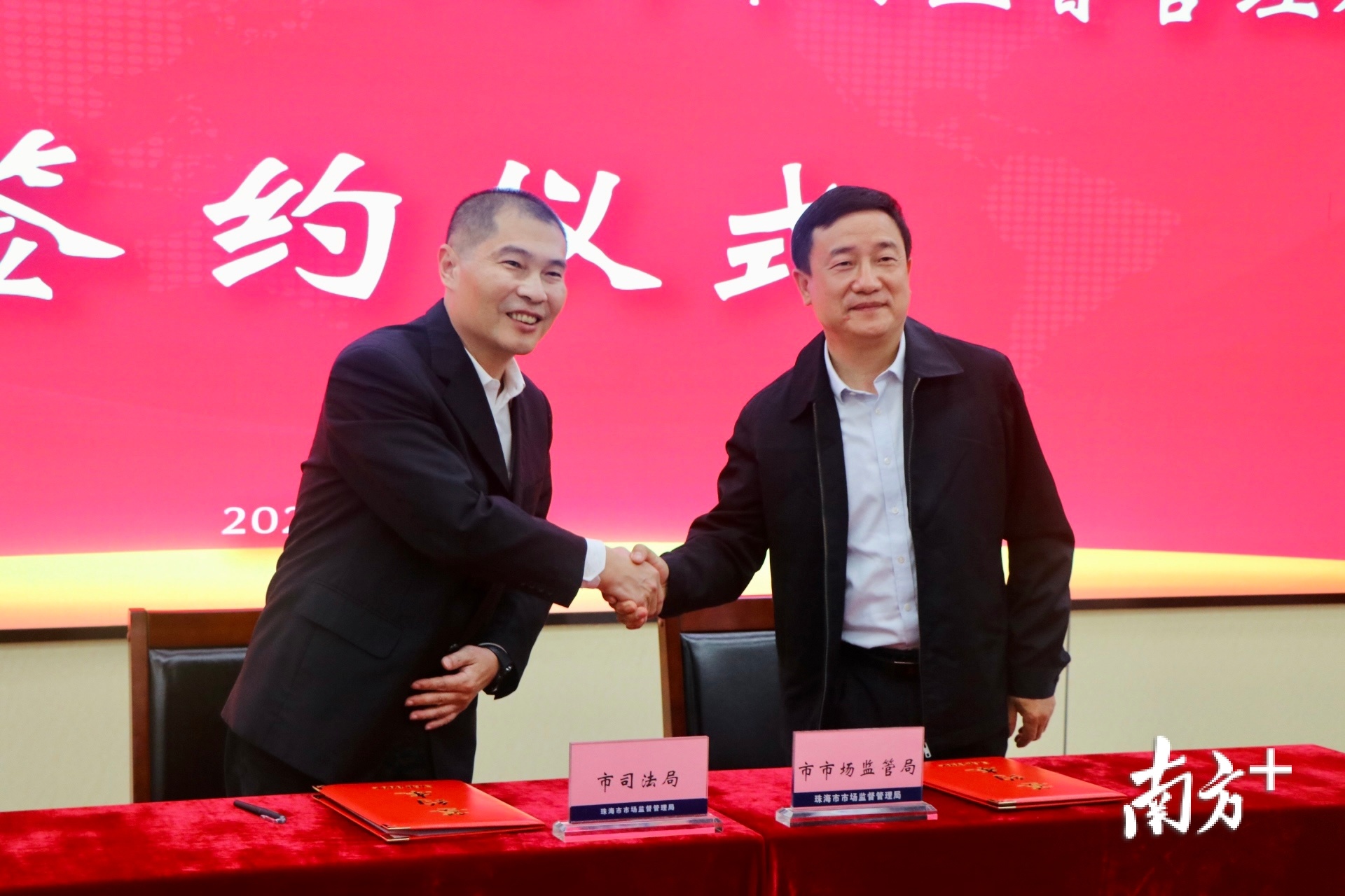 市市场监管局局长石学斌和市司法局局长李红平共同签署《珠海市司法局 珠海市市场监督管理局合作协议》。